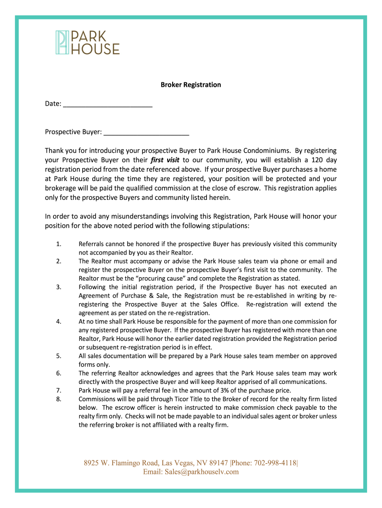 Broker Registration Date: Prospective Buyer: Thank you for introducing your prospective Buyer to Park House Condominiums. By registering your Prospective Buyer on their first visit to our community,