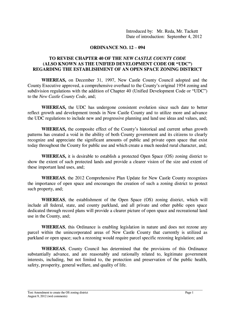 Introduced by: Mr. Red, Mr. Hackett Date of introduction: September 4, 2012, ORDINANCE NO. 12 094 TO REVISE CHAPTER 40 OF THE NEW CASTLE COUNTY CODE (ALSO KNOWN AS THE UNIFIED DEVELOPMENT CODE OR