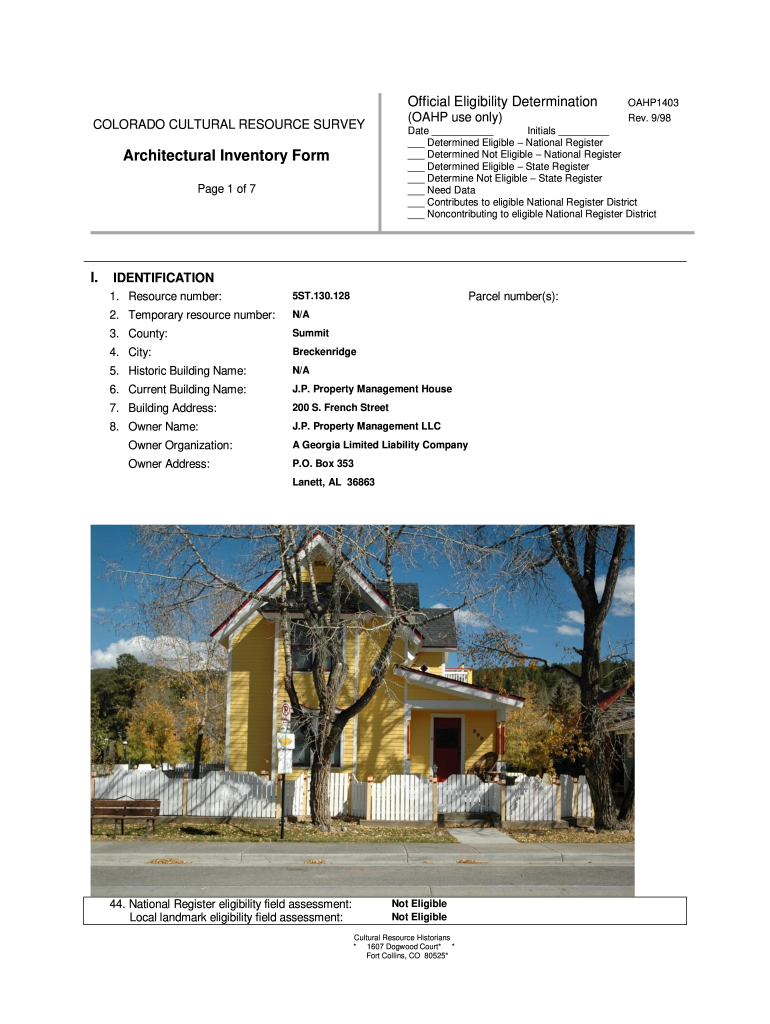 Official Eligibility Determination COLORADO CULTURAL RESOURCE SURVEYArchitectural Inventory Form Page 1 of 7I.(OAHU use only)Date Initials Determined Eligible National Register Determined Not Eligible