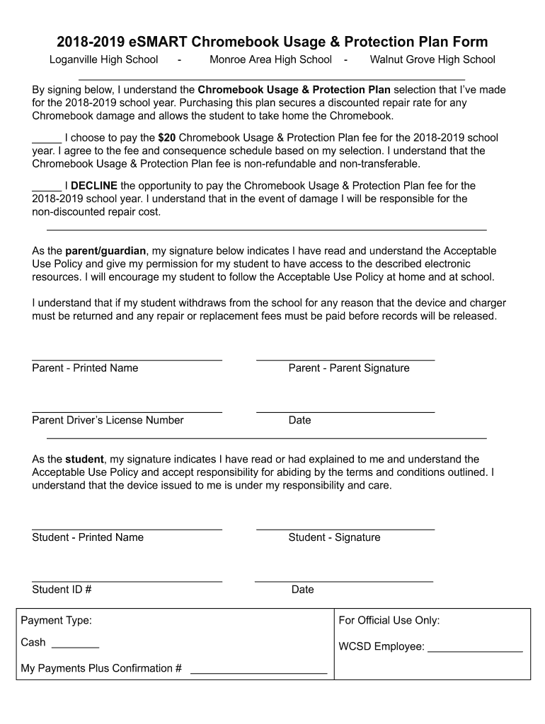 20182019 smart Chromebook Usage & Protection Plan Form Loganville High School Monroe Area High School Walnut Grove High School By signing below, I understand the Chromebook Usage & Protection Plan