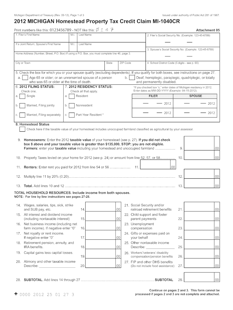 Sample Completed Michigan Homestead Property Tax Credit Claim