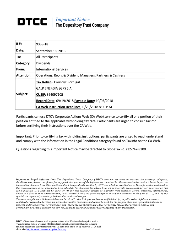 Important Notice The Depository Trust Company #:933818Date:September 18, 2018To:All ParticipantsCategory:DividendsFrom:International ServicesAttention:Operations, Reorg & Dividend Managers, Partners