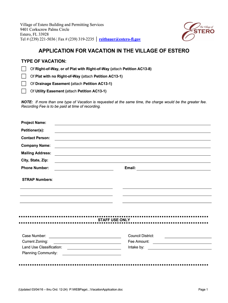 Village of Ester Building and Permitting Services 9401 Corkscrew Palms Circle Ester, FL 33928 Tel # (239) 2215036 Fax # (239) 3192235 rather esterify. Application FOR VACATION IN THE VILLAGE OF ESTER