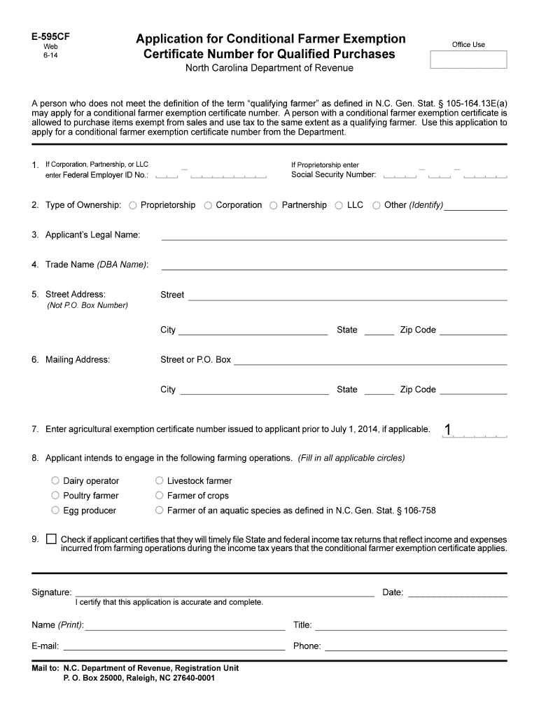 The North Carolina Conditional Farmer Exemption Application is essential for individuals or entities looking to apply for a conditional farmer exemption certificate. This specific form, known as the E-595CF, serves a pivotal role in enabling farmers to obtain tax savings on eligible purchases. By securing this certificate, applicants can buy items necessary for their farming operations free from sales and use tax, thereby significantly reducing operational costs.