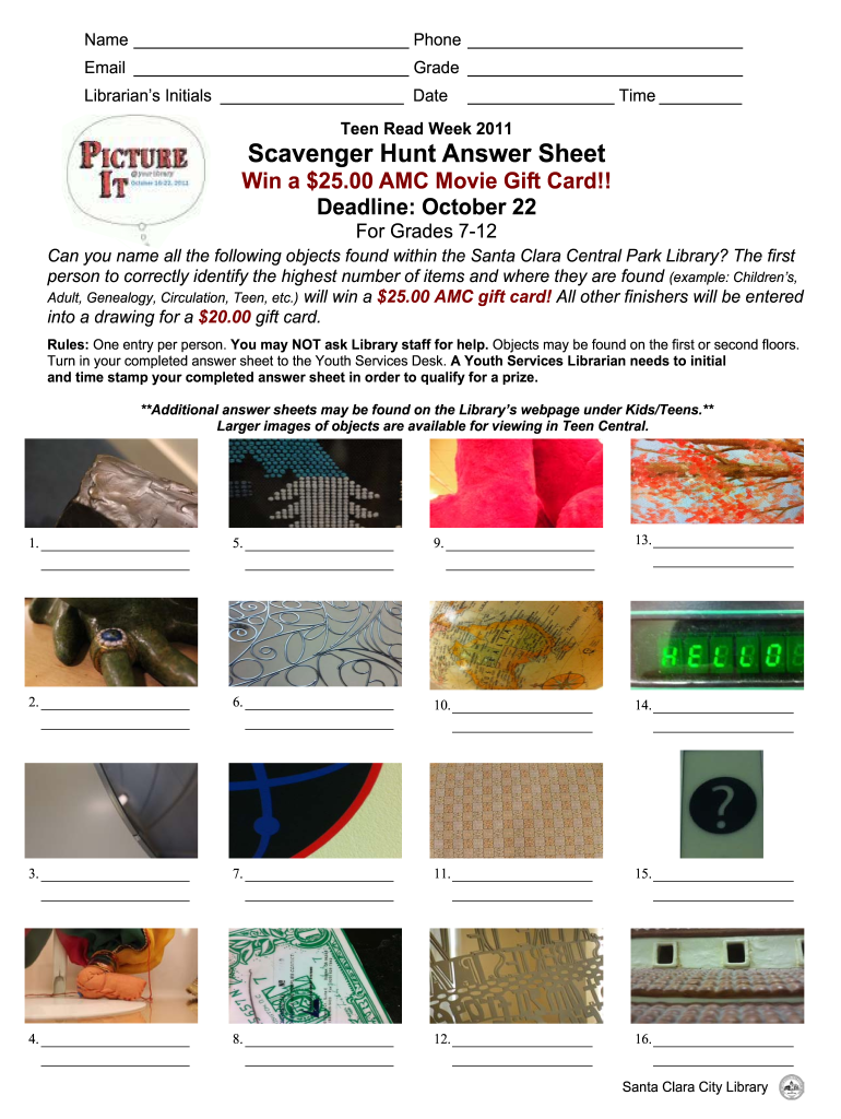 Name Phone Email Grade Librarians Initials Date Time Teen Read Week 2011Scavenger Hunt Answer Sheet Win a $25.00 AMC Movie Gift Card!! Deadline: October 22 For Grades 712 Can you name all the following
