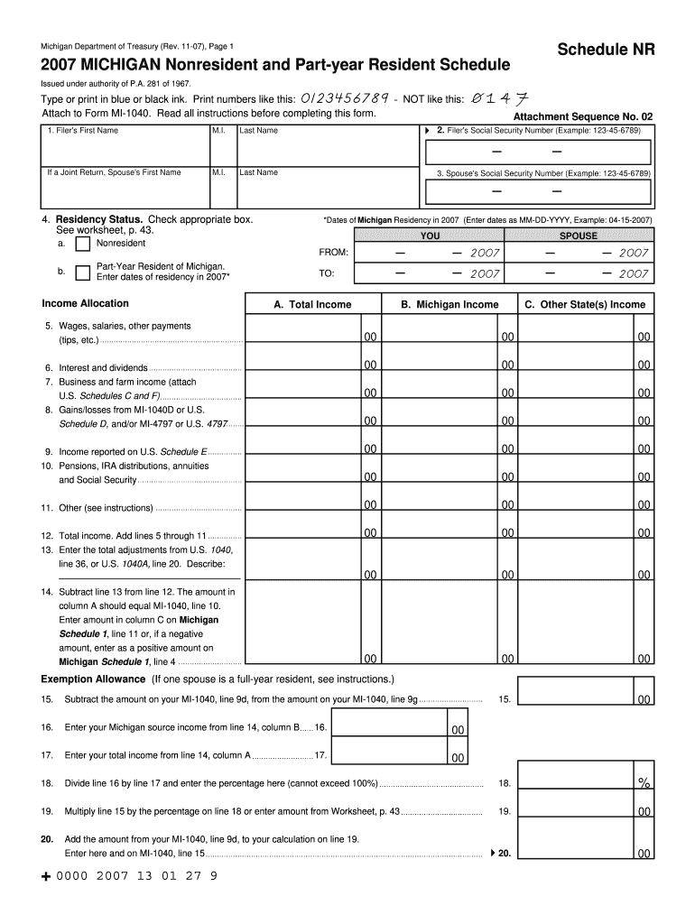 Sample or Example of a Completed Michigan Nonresident and Part-Year Resident Schedule