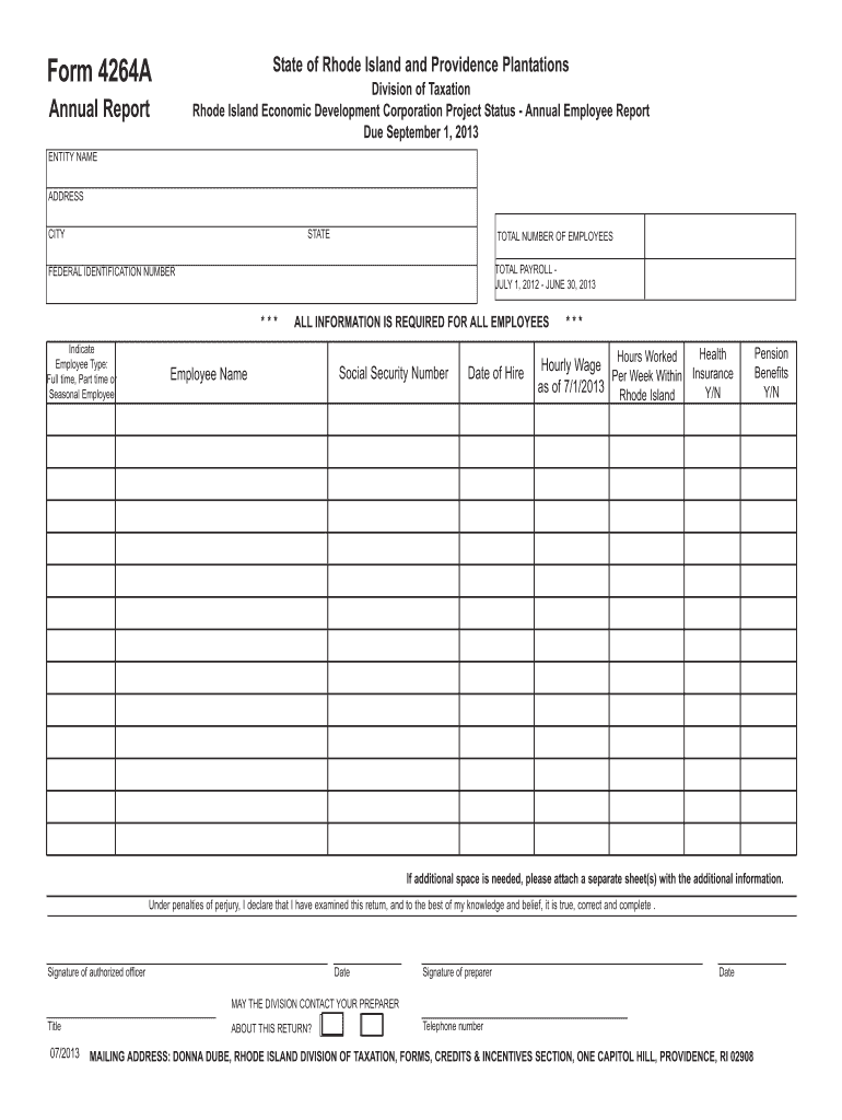 State of Rhode Island and Providence Plantations Form 4264A Division of Taxation Rhode Island Economic Development Corporation Project Status Annual Employee Report Due September 1, 2013, Annual Report