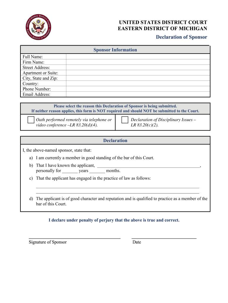 UNITED STATES DISTRICT COURT EASTERN DISTRICT OF MICHIGAN Declaration of Sponsor Information Full Name: Firm Name: Street Address: Apartment or Suite: City, State and Zip: Country: Phone Number: Email