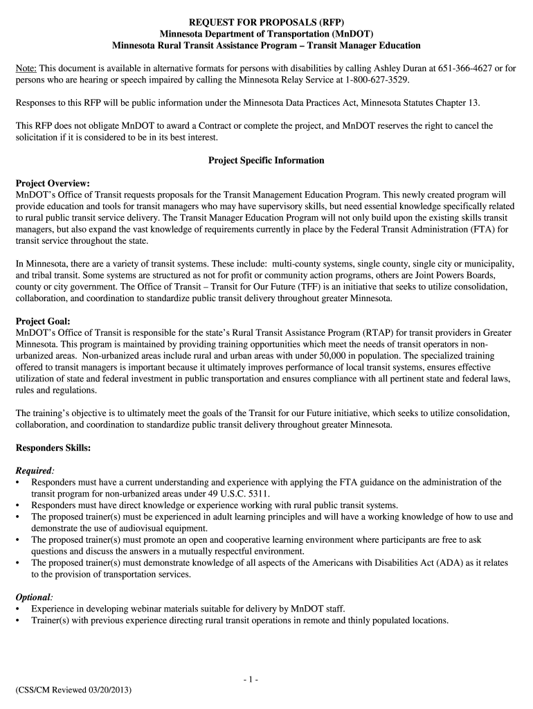 REQUEST FOR PROPOSALS (RFP) Minnesota Department of Transportation (Mn DOT) Minnesota Rural Transit Assistance Program Transit Manager Education Note: This document is available in alternative formats