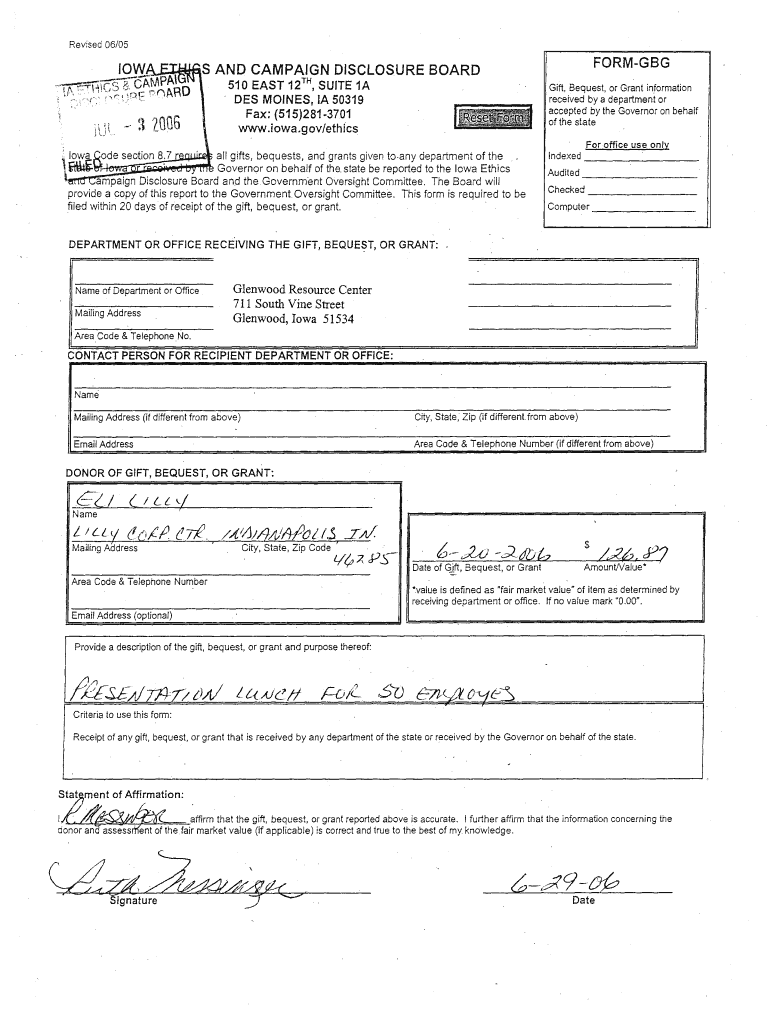Revised 06/05FORMGBGAND CAMPAIGN DISCLOSURE BOARD 510 EAST 12 r “, SUITE 1A DES MOINES, IA 50319 Fax : (515)2813701Gift, Bequest, or Grant information received by a department or accepted by the