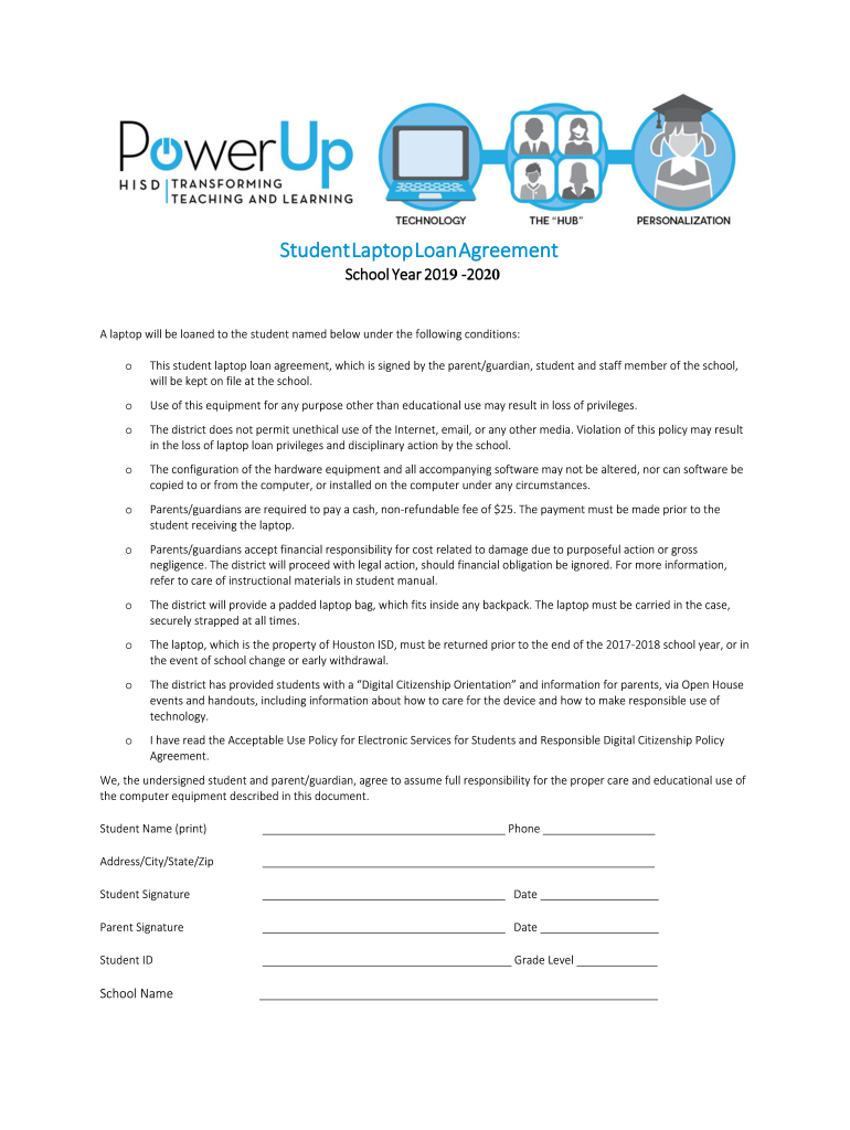 Student Laptop Loan AgreementSchool Year 2019 2020A laptop will be loaned to the student named below under the following conditions:this student laptop loan agreement, which is signed by the parent/guardian, student and staff member of the school,