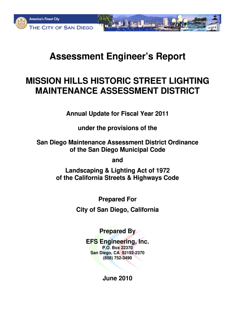 Assessment Engineers Report MISSION HILLS HISTORIC STREET LIGHTING MAINTENANCE ASSESSMENT DISTRICT Annual Update for Fiscal Year 2011 under the provisions of the San Diego Maintenance Assessment District