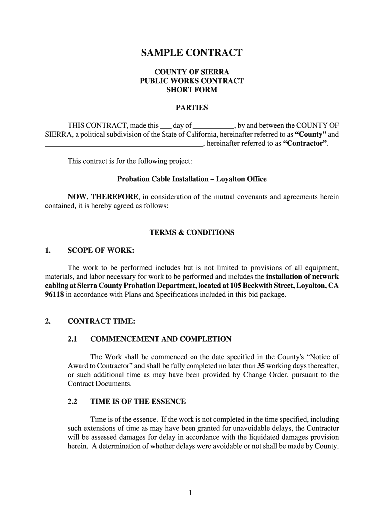 SAMPLE CONTRACT COUNTY OF SIERRA PUBLIC WORKS CONTRACT SHORT FORM PARTIES THIS CONTRACT, made this day of, by and between the COUNTY OF SIERRA, a political subdivision of the State of California,