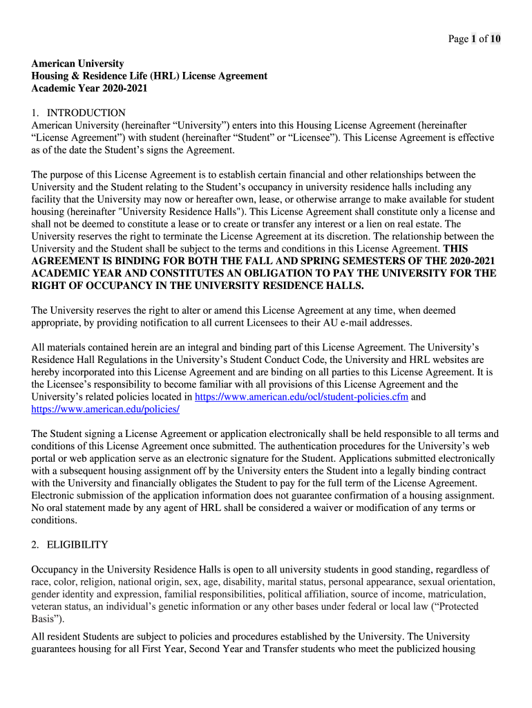 Page 1 of 10 American University Housing & Residence Life (NRL) License Agreement Academic Year 20202021 1. INTRODUCTION American University (hereinafter University) enters into this Housing License