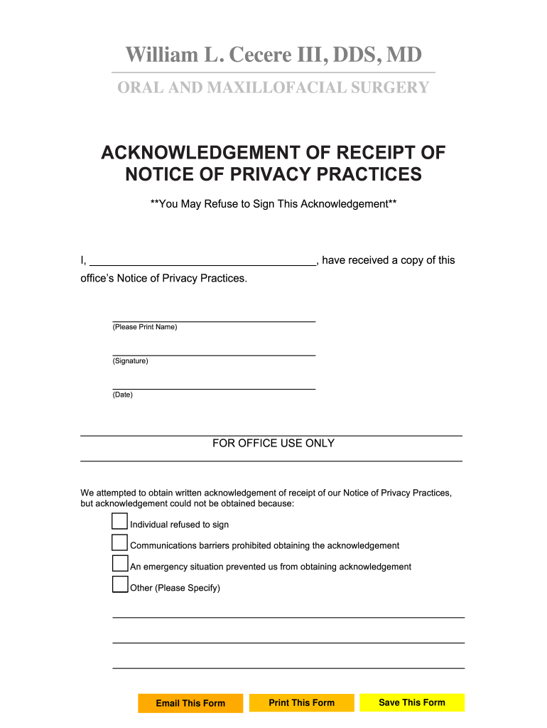 William L. Cedar III, DDS, MD ORAL AND MAXILLOFACIAL SURGERYACKNOWLEDGEMENT OF RECEIPT OF NOTICE OF PRIVACY PRACTICES **You May Refuse to Sign This Acknowledgement**I, have received a copy of these