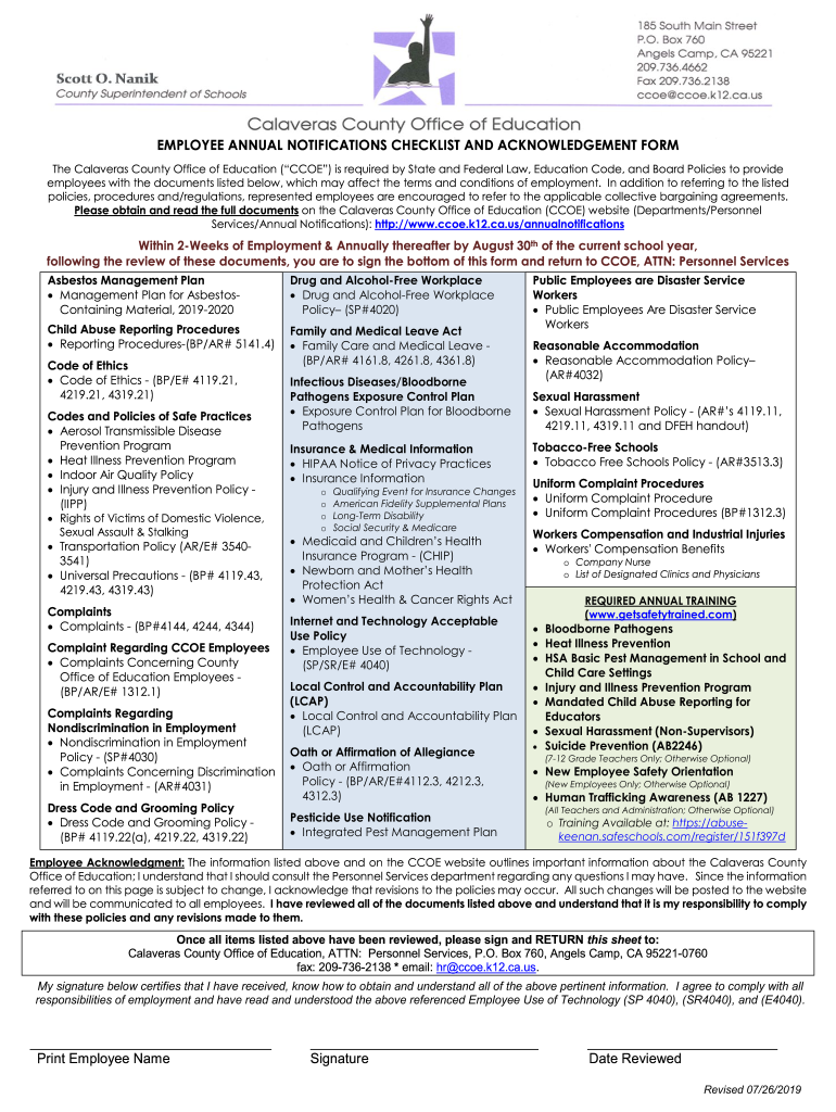 Get the free EMPLOYEE ANNUAL NOTIFICATIONS CHECKLIST AND ACKNOWLEDGEMENT FORM