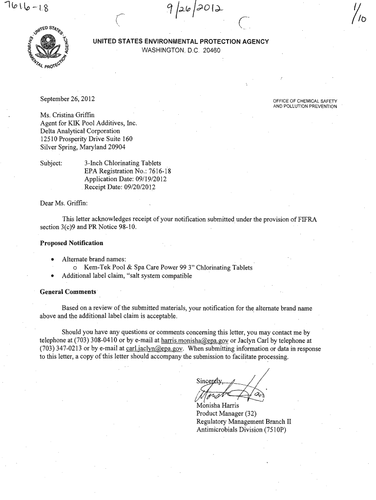 WASHINGTON. D.C. 20460September 26, 2012OFFICE OF CHEMICAL SAFETY