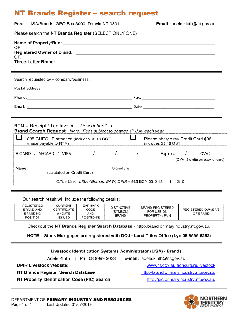 To fill out an NT Brands Registersearch request, one must complete the designated form with relevant details including brand name, applicant information, and any identification numbers before submitting it to the respective authority.