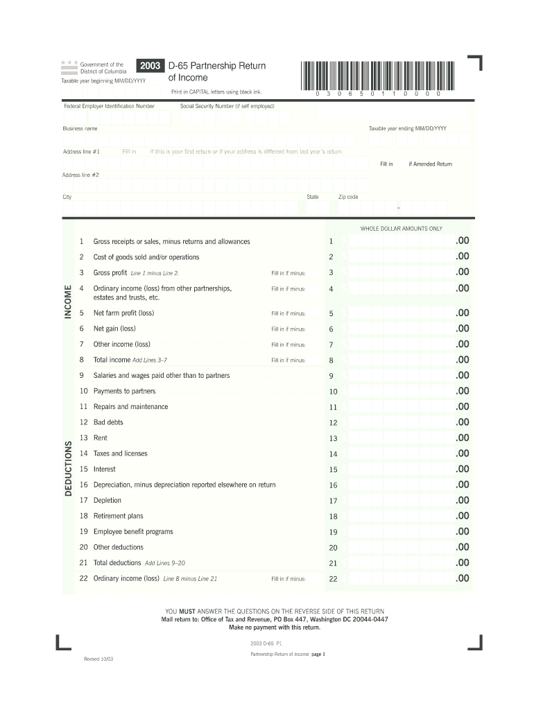 As a key document for partnership tax returns, the 2003 D-65 helps ensure that partnerships meet their financial reporting obligations and adhere to District of Columbia tax regulations.