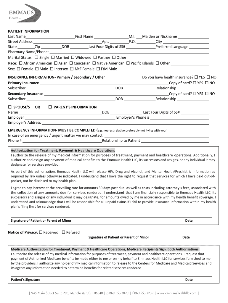 PATIENT INFORMATION Last Name First Name M.I. Maiden or Nickname Street Address Apt. P.O. City State Zip DOB Last Four Digits of SS# Preferred Language Pharmacy Name/Phone: Marital Status: Single