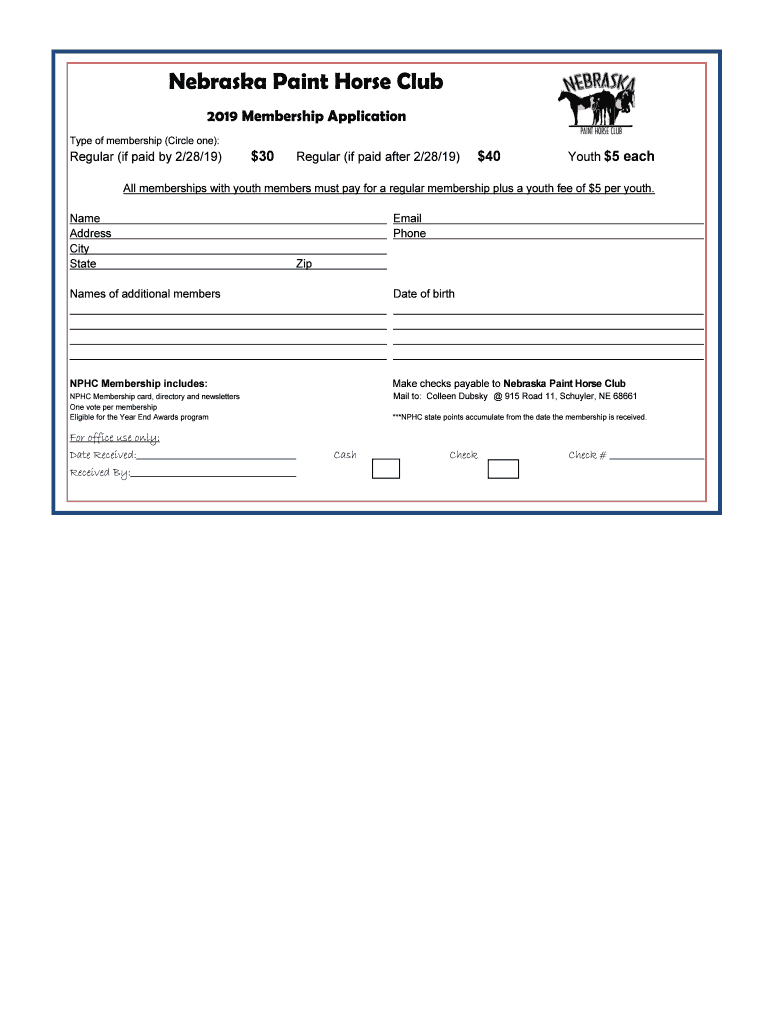Submit the completed application form along with the payment to the Nebraska Paint Horse Club Regional office.
