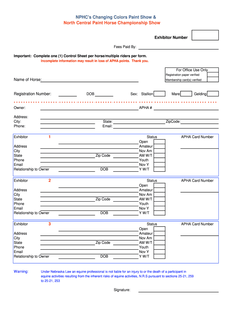 NPHC's Changing Colors Paint Show & North Central Paint Horse Championship Show Exhibitor Number Fees Paid By: Important: Complete one (1) Control Sheet per horse/multiple riders per form. Incomplete