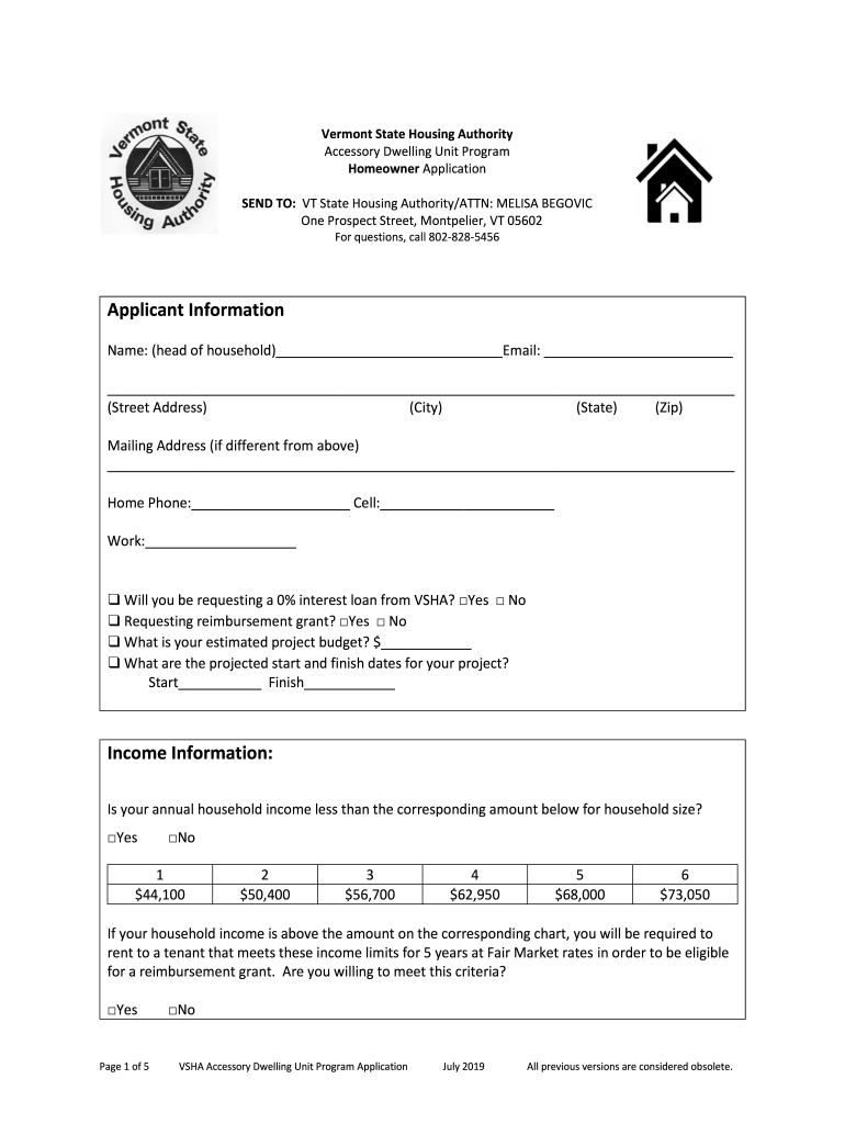 Vermont State Housing Authority Accessory Dwelling Unit Program Homeowner Application SEND TO: VT State Housing Authority/ATTN: MELISA SEGOVIA One Prospect Street, Montpelier, VT 05602 For questions,