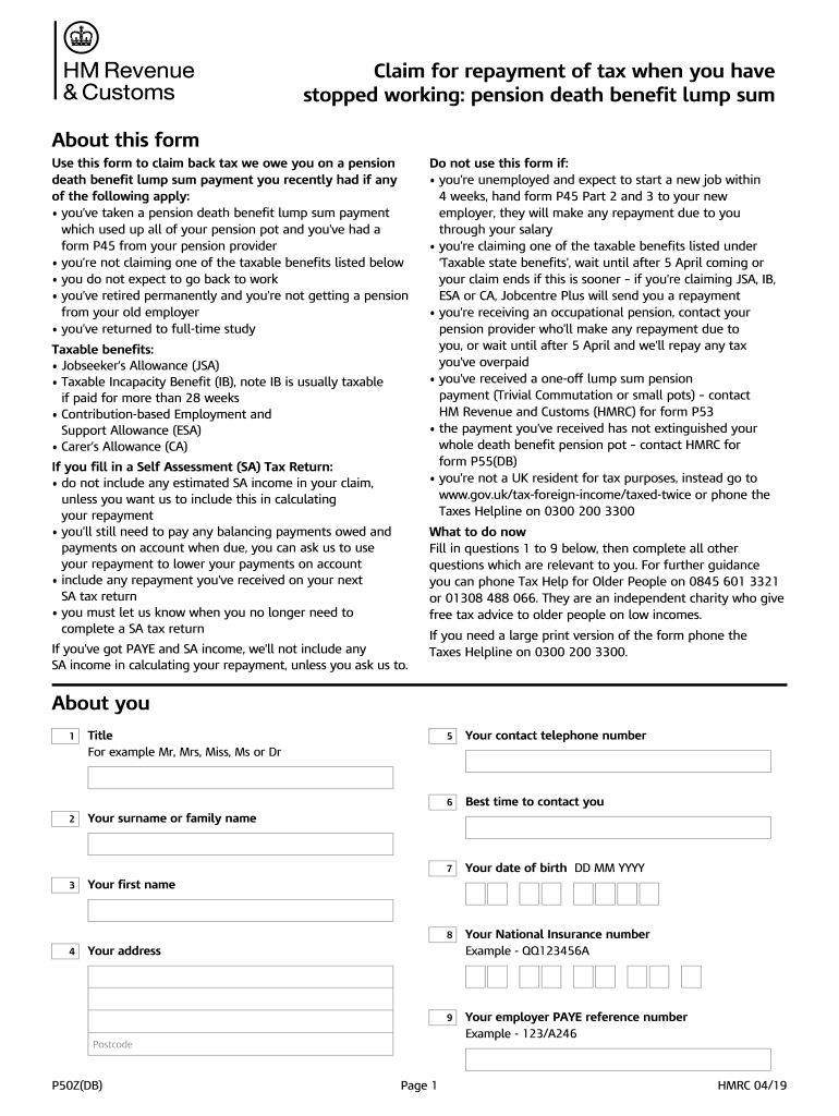 Claim for repayment of tax when you have stopped working: pension death benefit lump sum About this form Use this form to claim back tax we owe you on a pension death benefit lump sum payment you