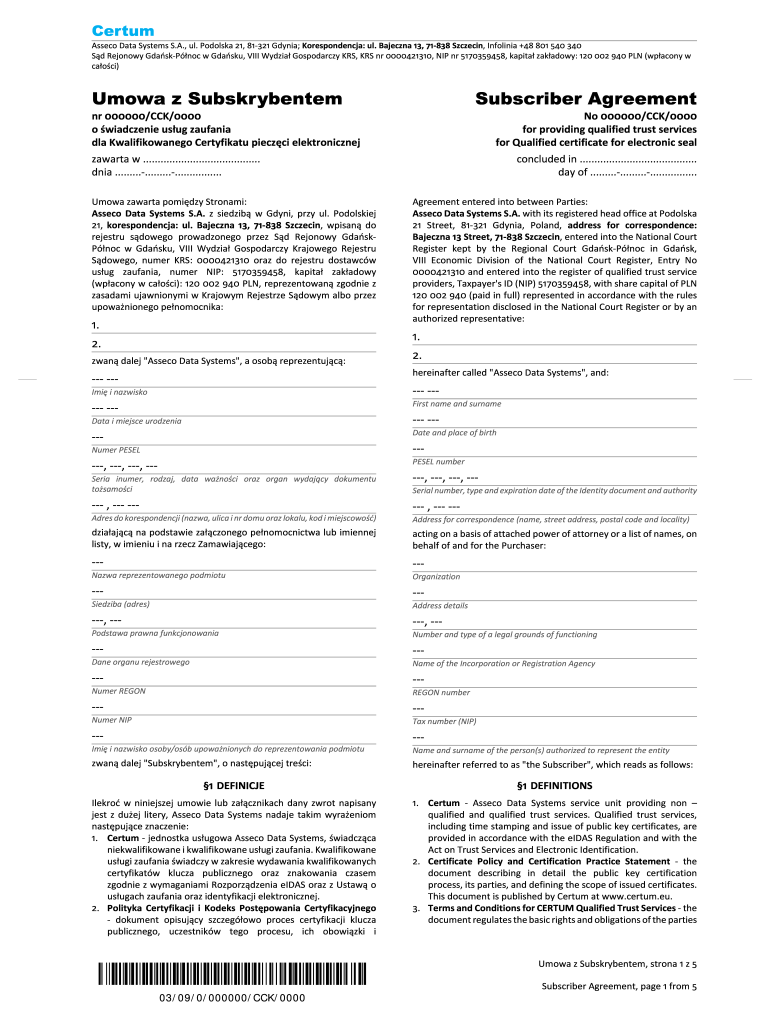 Get the free No 000000/CCK/0000 Umowa z Subskr ybentem Subscriber Ag r eement
