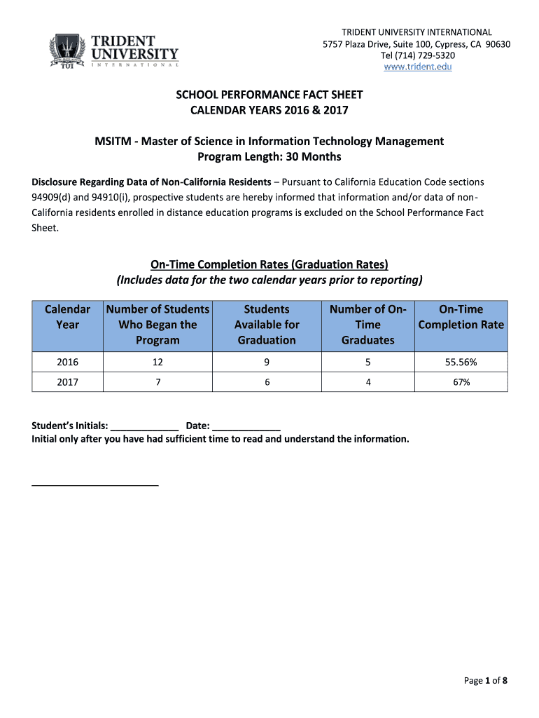 TRIDENT UNIVERSITY INTERNATIONAL 5757 Plaza Drive, Suite 100, Cypress, CA 90630 Tel (714) 7295320 www.trident.eduSCHOOL PERFORMANCE FACT SHEET CALENDAR YEARS 2016 & 2017 MSIT Master of Science in