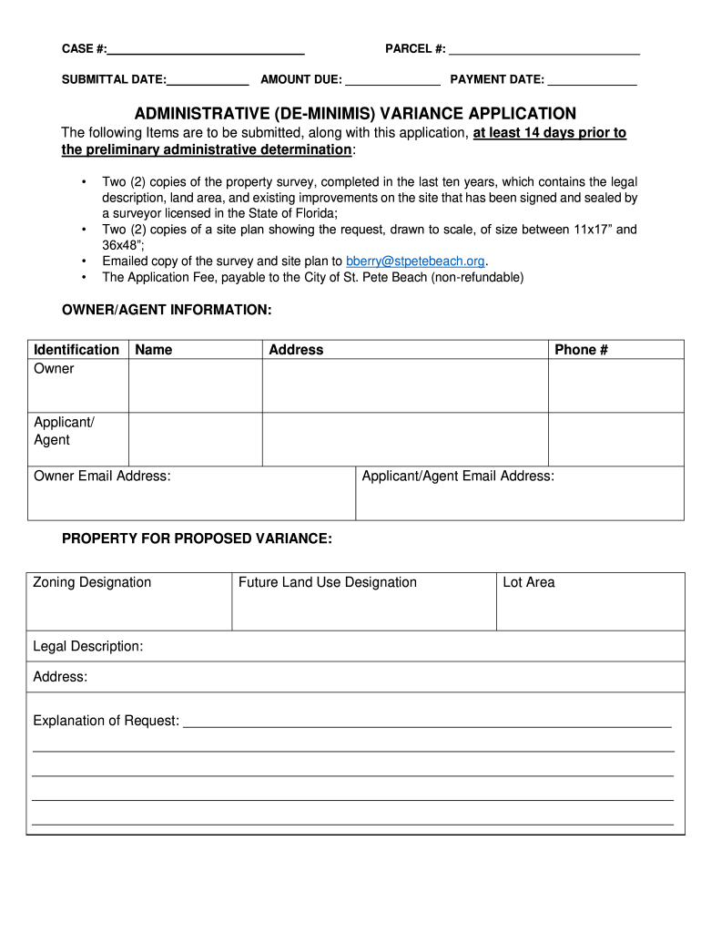 CASE #: PARCEL #: SUBMITTAL DATE: AMOUNT DUE: PAYMENT DATE: ADMINISTRATIVE (DOMINIONS) VARIANCE APPLICATION The following Items are to be submitted, along with this application, at least 14 days prior