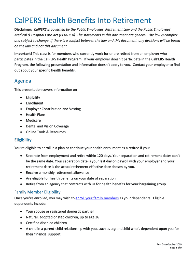 Callers Health Benefits Into Retirement Disclaimer: Callers is governed by the Public Employees Retirement Law and the Public Employees Medical & Hospital Care Act (PEM HCA). The statements in this