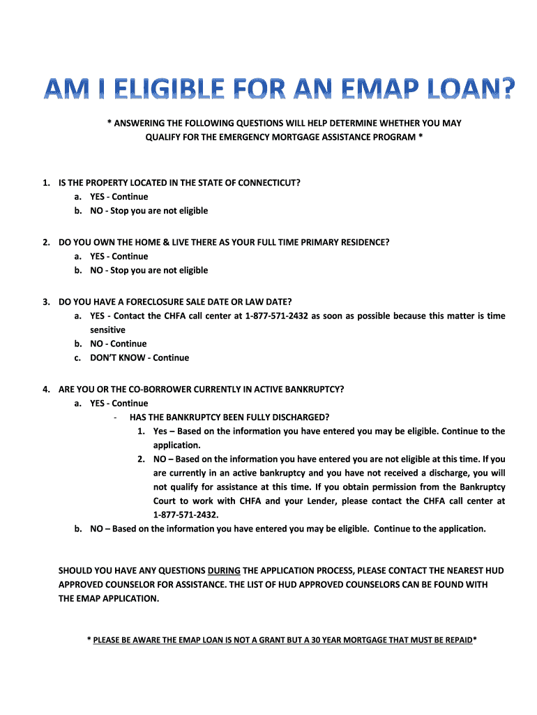 * ANSWERING THE FOLLOWING QUESTIONS WILL HELP DETERMINE WHETHER YOU MAY QUALIFY FOR THE EMERGENCY MORTGAGE ASSISTANCE PROGRAM *1. IS THE PROPERTY LOCATED IN THE STATE OF CONNECTICUT? a. YES Continue