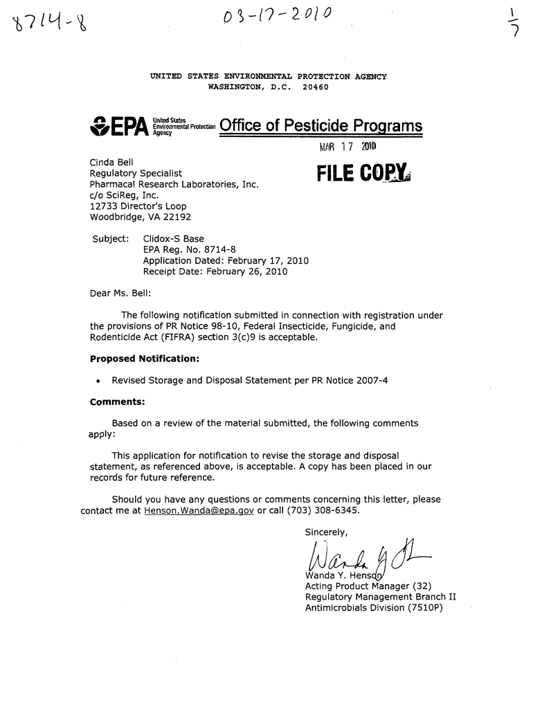 O72010UNITED STATES ENVIRONMENTAL PROTECTION AGENCY WASHINGTON, D.C. 20460&EPA r;S:BIF 'protection Office of Pesticide Programs MAR 1 7 LD10 Linda Bell Regulatory Specialist Pharmacy Research Laboratories,