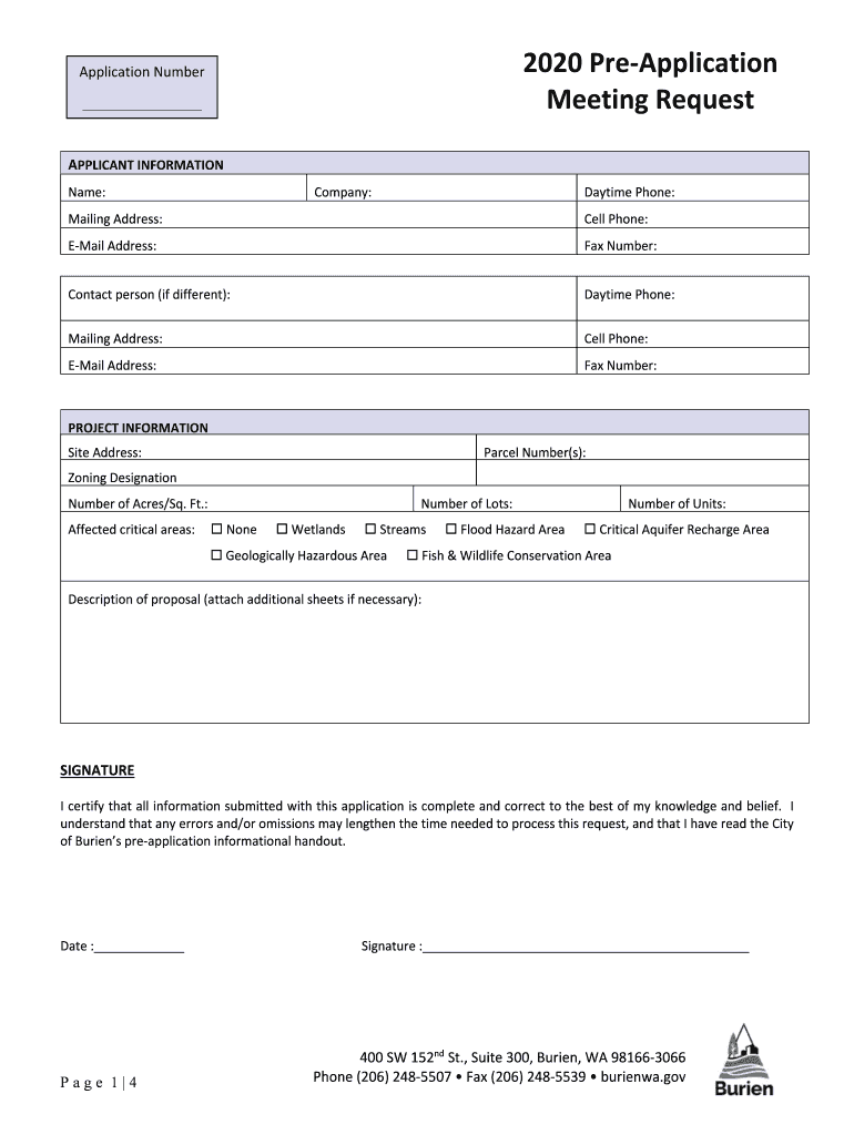 2020PreApplication MeetingRequestApplicationNumber APPLICANTINFORMATION Name:MailingAddress:Misaddress:Company:DaytimePhone:Cellphone:Number:Contact person(indifferent): DaytimePhone:MailingAddress:Cellphone:Misaddress:Number: