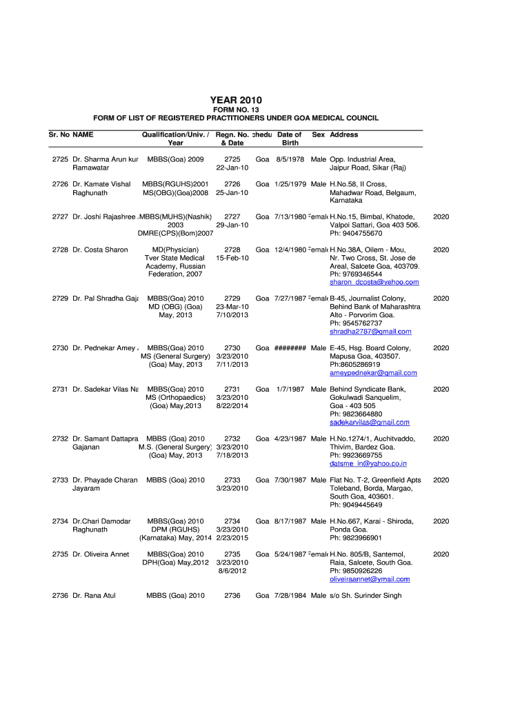 YEAR 2010 FORM NO. 13 FORM OF LIST OF REGISTERED PRACTITIONERS UNDER GOA MEDICAL COUNCIL Sr. No Prequalification/Univ. / Reign. No. Schedule Date of Year Birth & Date2725 Dr. Sharma Arun kumarMBBS(Goa)