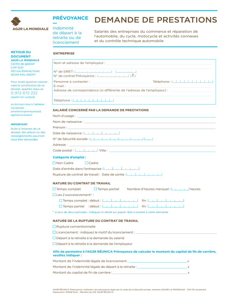 PURVEYANCE DEMAND DE PRESTATIONSIndemnit de part la retrieve of de licenciement DETOUR DU DOCUMENT AG2R LA MONDALE Center de section CAP SUD 100 rue Bienne Dole 92245 PLAYOFF Pour route question concern