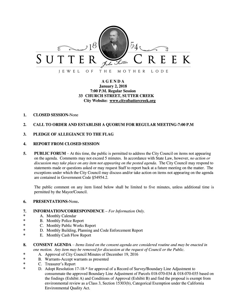 AGENDA January 2, 2018 7:00 P.M. Regular Session 33 CHURCH STREET, SUTTER CREEK City Website: www.cityofsuttercreek.org1.CLOSED SESSIONNone2.CALL TO ORDER AND ESTABLISH A QUORUM FOR REGULAR MEETING7:00