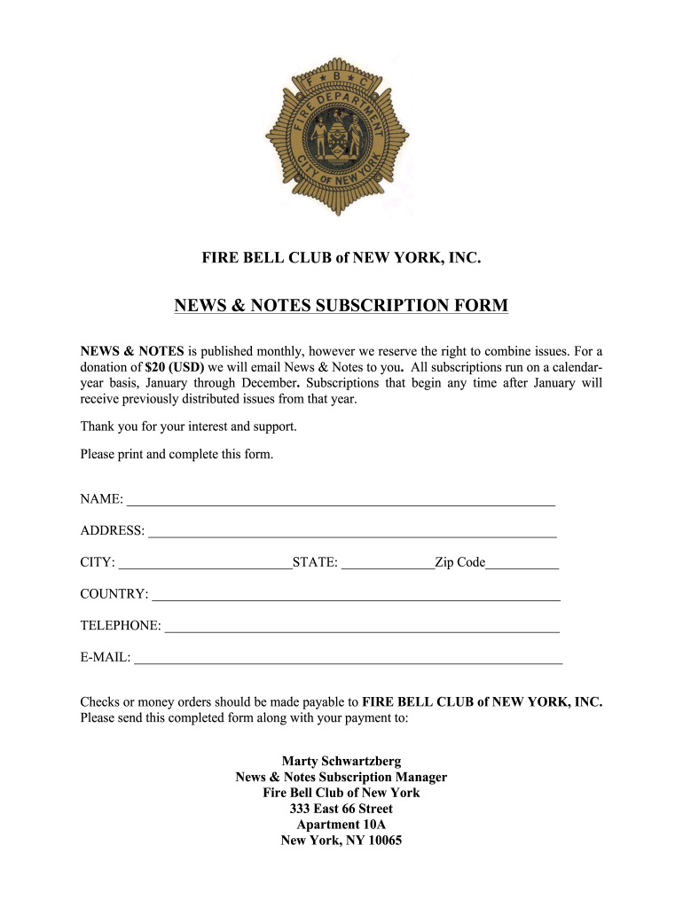 FIRE BELL CLUB of NEW YORK, INC.NEWS & NOTES SUBSCRIPTION FORM NEWS & NOTES is published monthly, however we reserve the right to combine issues. For a donation of $20 (USD) we will email News & Notes