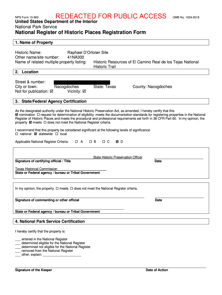 NPS Form 10900REDEACTED FOR PUBLIC ACCESS OMB No. 10240018United States Department of the Interior National Park ServiceNational Register of Historic Places Registration Form 1. Name of Property Historic