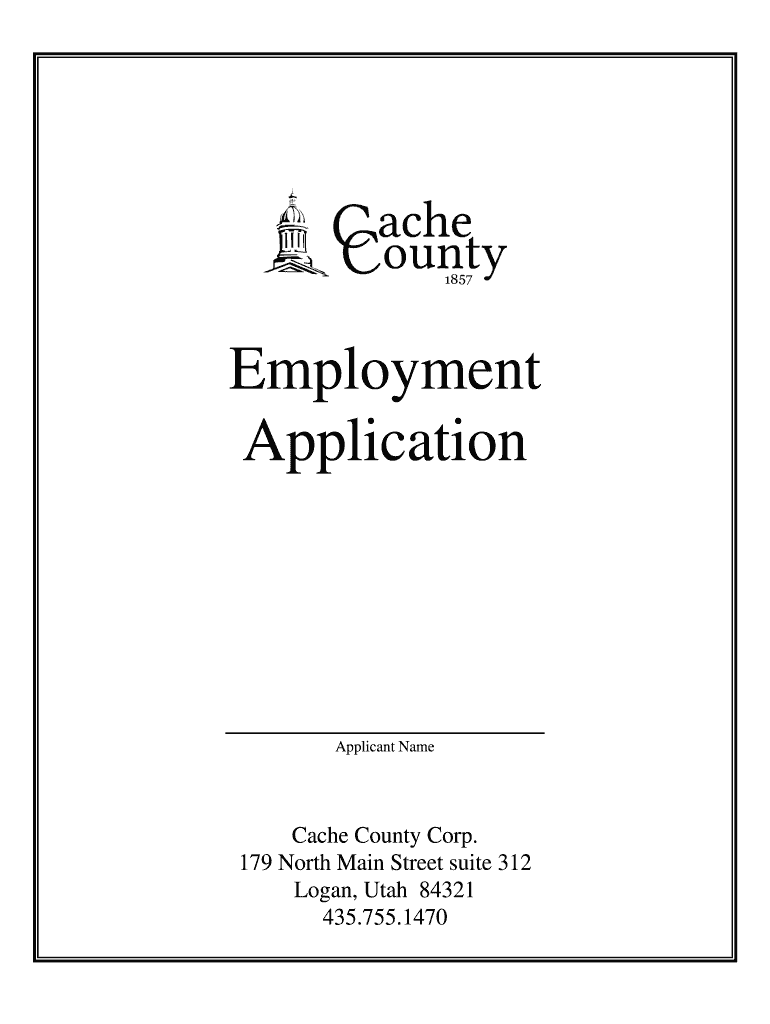 Employment Application Applicant Name Cache County Corp. 179 North Main Street suite 312 Logan, Utah 84321 435.755.1470 PLEASE PRINT CLEARLY Personal Information First Name: Middle Initial: Last Name: