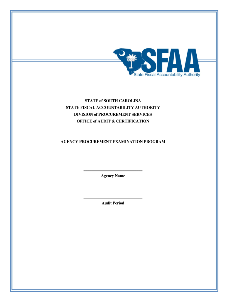 STATE of SOUTH CAROLINA STATE FISCAL ACCOUNTABILITY AUTHORITY DIVISION of PROCUREMENT SERVICES OFFICE of AUDIT & CERTIFICATIONAGENCY PROCUREMENT EXAMINATION PROGRAM Agency Name Audit PeriodRevised