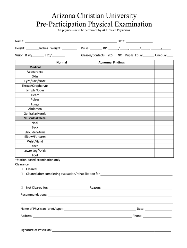 Arizona Christian University Participation Physical Examination All physicals must be performed by ACU Team Physicians. Name: Date: Height: Inches Weight: Pulse: BP: /, /, / Vision: R 20/ L 20/ Glasses/Contacts: