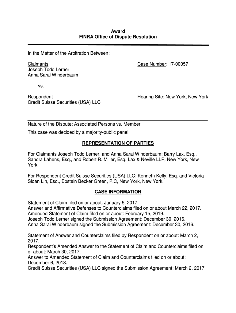 Award FINRA Office of Dispute Resolution In the Matter of the Arbitration Between: Claimants Joseph Todd Lerner Anna Sarah WinderbaumCase Number: 1700057vs. Respondent Credit Suisse Securities (USA)