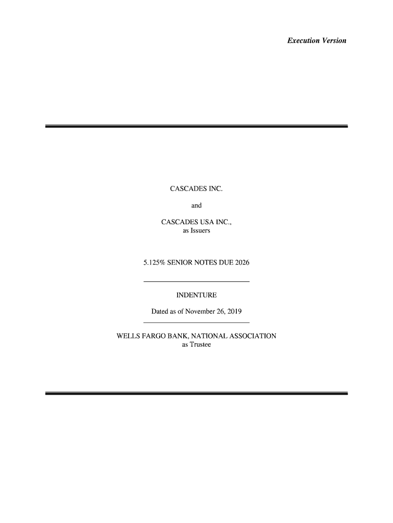 Execution VersionCASCADES INC. and CASCADES USA INC., as Issuers5.125% SENIOR NOTES DUE 2026 INDENTURE Dated as of November 26, 2019, WELLS FARGO BANK, NATIONAL ASSOCIATION as Trustable OF CONTENTS