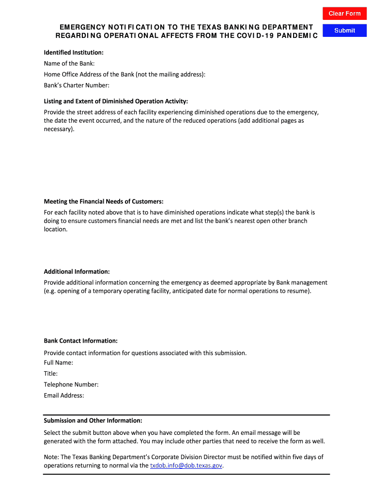 Clear FormEMERGENCY NOTIFICATION TO THE TEXAS BANKING DEPARTMENT