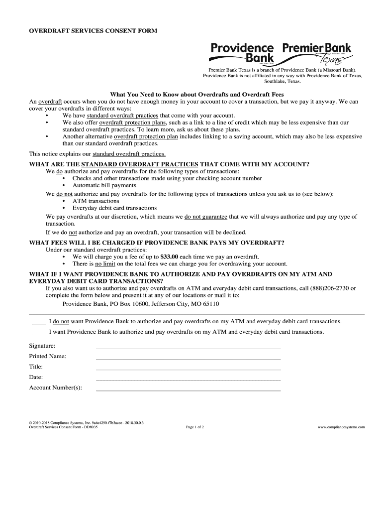 OVERDRAFT SERVICES CONSENT FORMPremier Bank Texas is a branch of Providence Bank (a Missouri Bank). Providence Bank is not affiliated in any way with Providence Bank of Texas, South lake, Texas. What