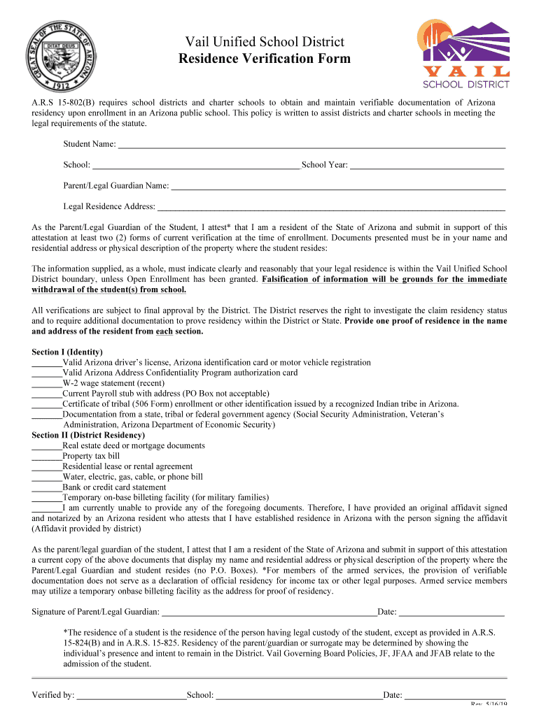 View Unified School District Residence Verification Form. R. S 15802(B) requires school districts and charter schools to obtain and maintain verifiable documentation of Arizona residency upon enrollment