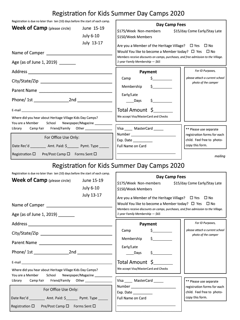 Registration for Kids Summer Day Camps 2020 Registration is due no later than ten (10) days before the start of each camp. Week of Camp (please circle)June 1519 July 610 July 1317Name of Camper Day