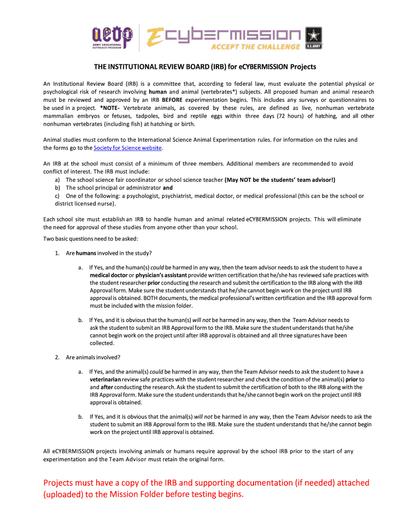 THE INSTITUTIONAL REVIEW BOARD (IRB) for eCYBERMISSION Projects